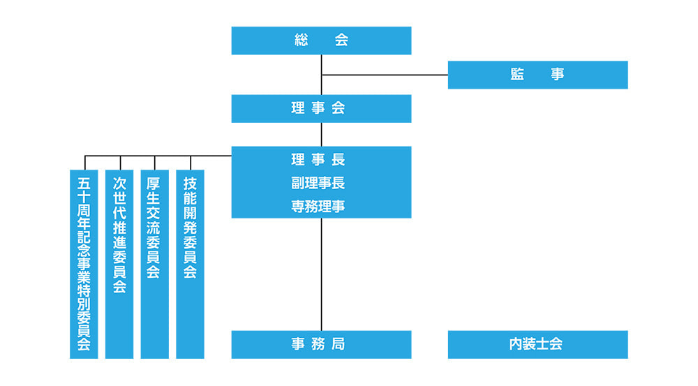 ■目 的 | 神奈川県内において、室内装飾資材及び製品の販売また加工を行なう業者及び内装施工等工事請負に携わる者の相互扶助の精神に基づき、自主的な経済活動を促進し、経済的、社会的地位の向上を図ることを目的としています。 |